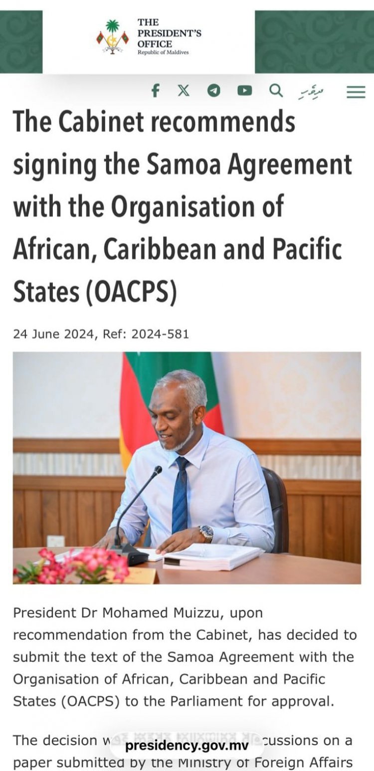 ސަމޯއާ އެގްރީމަންޓް އަކީ އޯއޭސީޕީއެސް-އީޔޫ ޕާޓްނަރ ޝިޕް އެގްރީމަންޓެވެ. މި އެގްރީމަންޓްގައި ސޮއި ކުރީ 1 ޖުލައި 2024 ގައެވެ. ބައިނަލް މީޑިއާ ތަކުގައި ސިފަކޮށްފައިވަނީ “ ދިވެހިރާއްޖެއިން ތާރީހީ ސަމޯއާ އެގްރީމަންޓްގައި ސޮއި ކޮށްފި” ކަމެވެ. ސަމޯއާ އެގްރީމަންޓްގައި ސޮއި ކުރީ އޭރު ދިވެހިރާއްޖެއިން ބެލްޖިއަމް އަށް ކަނޑައަޅުއްވާފައިވާ ސަފީރު ގީލާ އަލީ އެވެ.